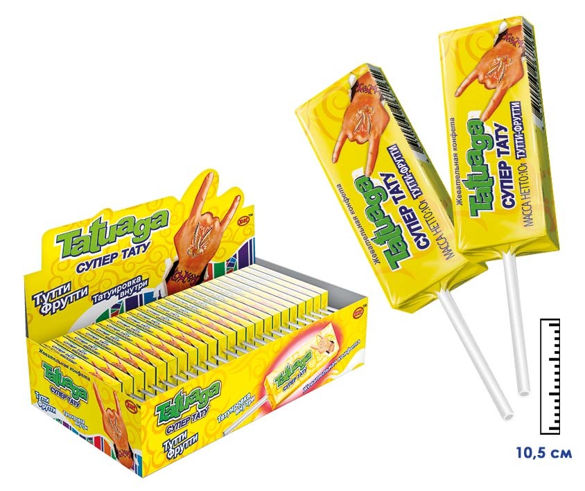 Жевательная конфета на палочке Tatuaga с тату Тутти-Фрутти (Пакистан) 10г5,30 руб. за штуку (в упак. 50 шт.) |